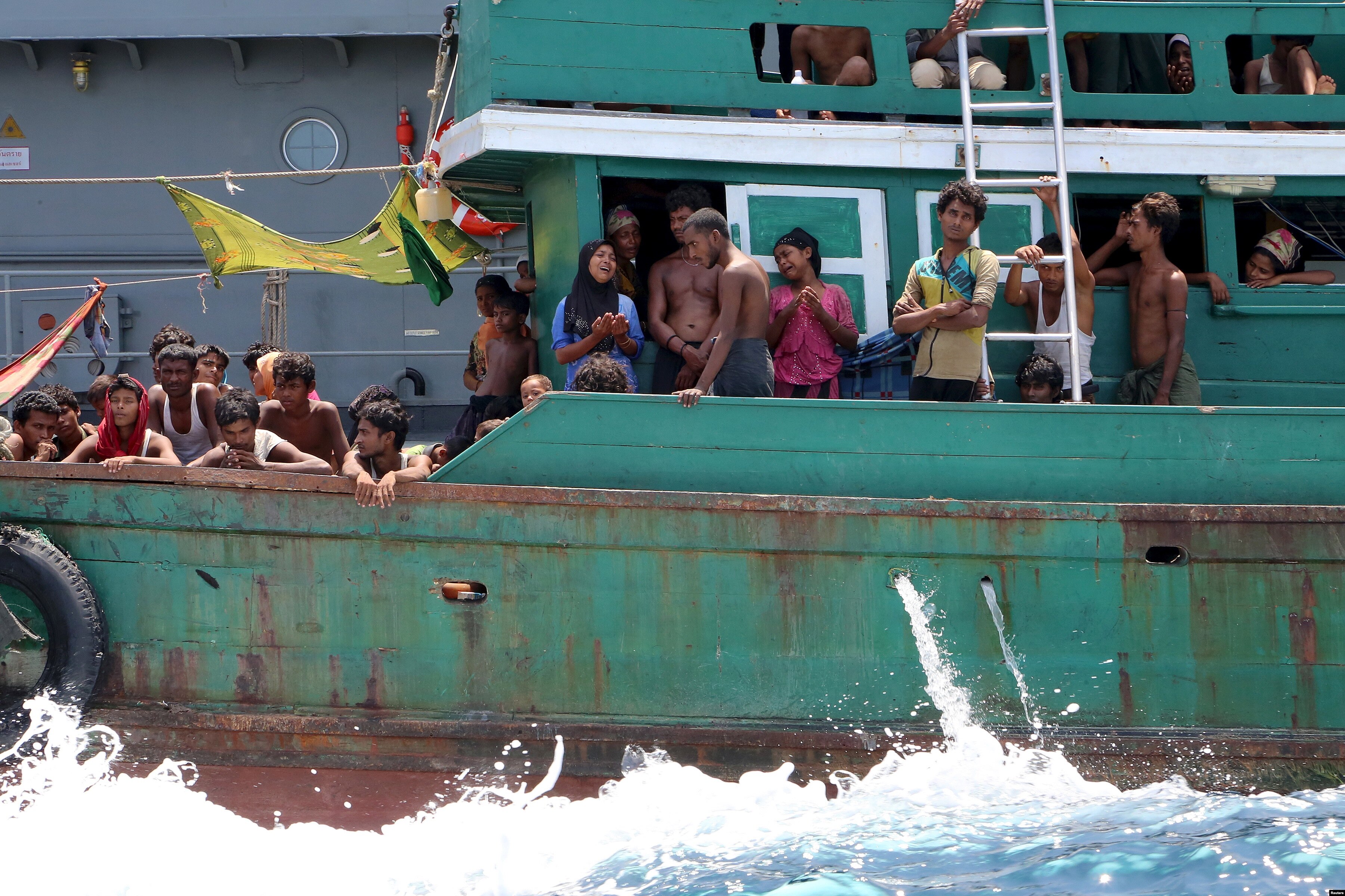 Beberapa migran putus asa setelah angkatan laut Thailand menghalau kapal mereka dari negara itu, di perairan dekat pulau Koh Lipe (16/5). (Reuters/Aubrey Belford)